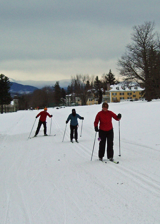 Second was our location. We were in Maine for the weekend, and chose to do our first cross-country outing on the beautifully groomed, golf-course-smooth trails at the Bethel Inn. What a lovely setting, on the edge of a charming village with views across the Androscoggin River valley to the mountains of Western Maine!