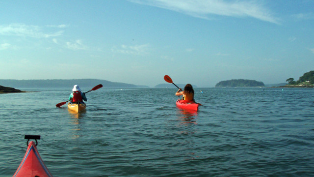 Paddling a kayak on a saltwater bay is about as quiet and contemplative as an active outdoor sport can be. You glide along at your own pace. When you want to take a break, you just rest the paddle on the deck in front of you and sit as long as you want.