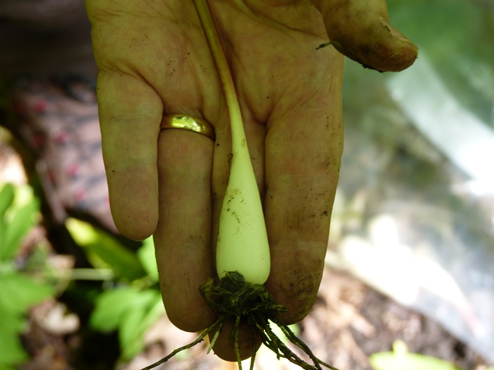 At this point, we began to experience one of those anticipatory moments which makes digging wild leeks so much fun. The aroma of freshly dug wild leeks is potent but heavenly, and in fact the leeks’ odor is considerably stronger than its taste. This aroma certainly enhances your anticipation for the pleasure of eating the leeks!