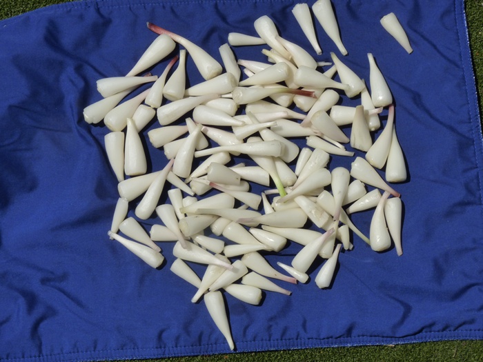 Once the leeks are safely above ground, there are several ways to handle them. They can be put whole in bags or baskets and taken home, where the tops can be used as greens, or chopped and put into such things as soups and stews, much as one would use chives. If the tops aren’t to be used, cut them off above the bulbs with a sharp knife. This is what we usually do. We also prefer at the same time to cut the roots off the bottom of the bulb and clean the worst of the dirt off it. Wild leeks, thus trimmed – even a lot of them – don’t take up much room, so we were able to carry our bounty of trimmed leek bulbs home in a quart plastic freezer bag.