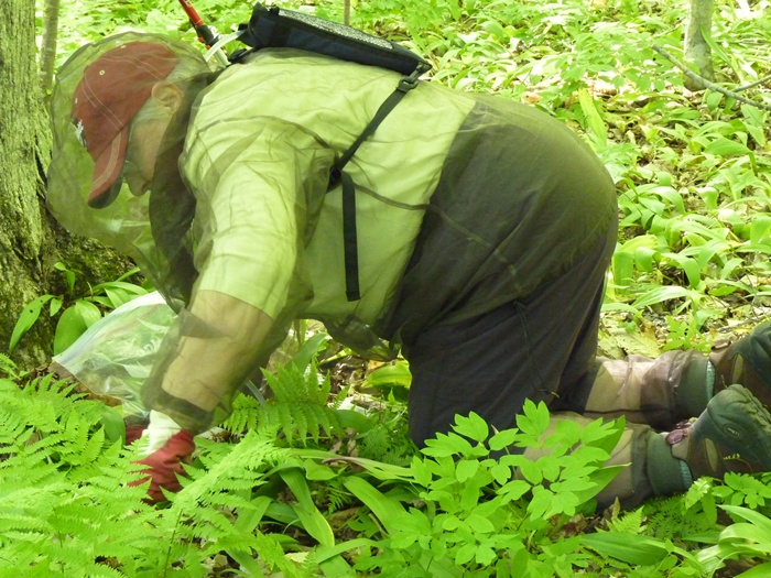 Unfortunately, there always seems to be a fly in every ointment, and the fly in the hunting wild leeks ointment happens to be an all-too-real fly, the black fly. The peak of these nasty biting insects happens to coincide with leek season, and the pesky critters abound in the area where we hunt wild leeks. Indeed, Warner often says that we’re the East Coast Distributors for black flies! Edie is particularly bothered by black fly bites, and so she set forth wearing a net bug suit suit from Bug Baffler that covered her from head to toe. If you haven’t tried one of these suits, they can provide complete protection from black flies and mosquitoes for adults and children alike.