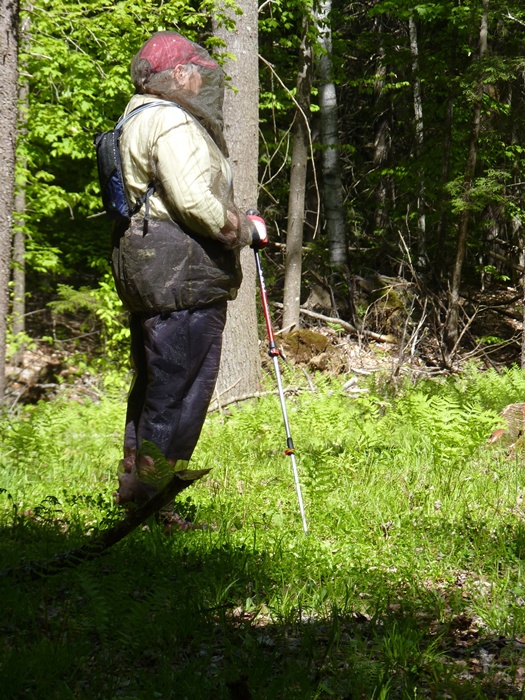 Suzy also had gotten a Bug Baffler suit, and was mightily impressed by their level of service: when she phoned the company at almost the last minute to order the suit, it arrived only a day later, in time for our leek adventure. Warner wore no netting because he is nearly immune to black flies, due to years spent in the woods, where he was bitten copiously. He says that black flies love Edie because she’s so sweet and tender, while they leave his tough, unpleasant-tasting hide alone! Edie agrees completely with this assessment. Suzy’s husband, Goddard, decided not to go with us because he had suffered a lot of black fly bites a few days before, and his arm had gotten badly swollen.