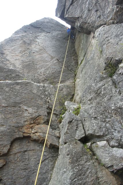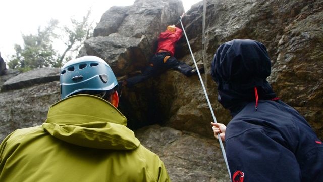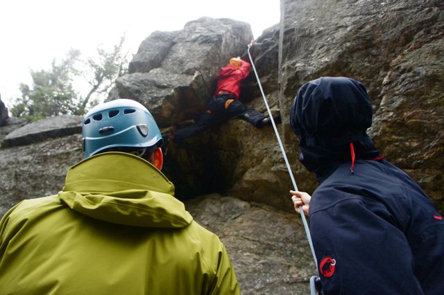 It’s all about teamwork! Casey climbs Practice Session with the assistance of Dan and Sam belaying. Practice Session is a challenge and a good pitch to learn vertical crack climbing. (Caroline MDonald photo)