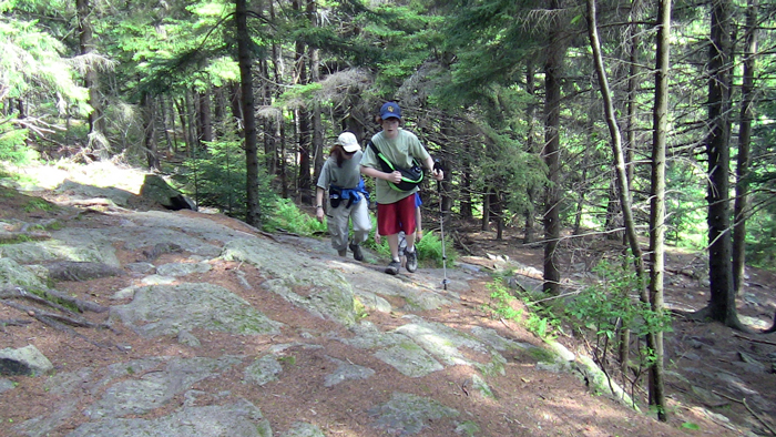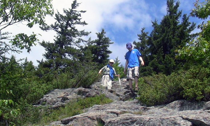 But Nature has a way of mending and restoring. The hike down was familiar and comforting, taking us past trailside patches of blueberries, over some interesting slick rock and through a couple of challenging rock scrambles. The shade of the maples, oaks, pine and hemlock kept our brains from devolving into further evil plotting, or at least I thought it did.